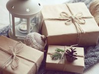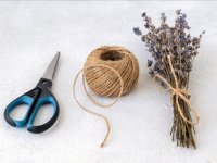 Natural hemp cord ball, scissors and dry lavender bouquet on a rough white surface. Roll of jute string or flax twine. Coarse rustic thread for souvenirs, macrame, craft or garden work. Top view.