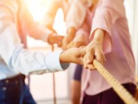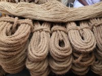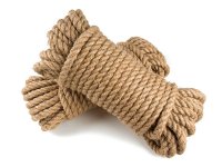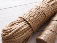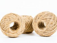 Natural jute twine roll on white wood background. Supplies and tools for handmade hobby leisure closeup